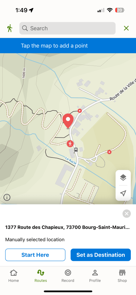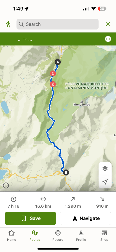 We used Komoot to plan our steps of the TMB. This gave us the opportunity to see how many km of hiking we were doing each day, the elevation gain and drop, and the total time it should take us. Since every hiker’s route everyday can be different due to the different starting points on the hike, it is difficult to find the exact pre-defined route of your day on Alltrails, which is why we used Komoot for this.